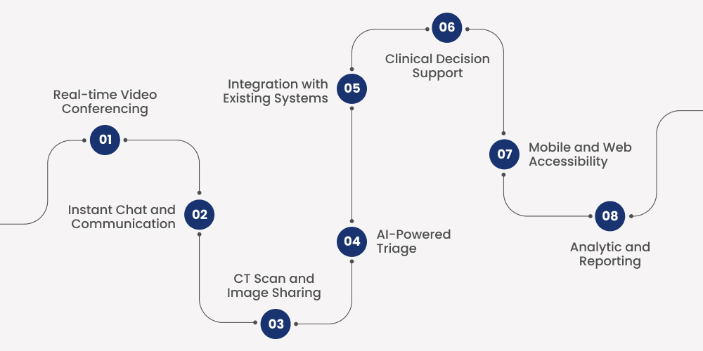 Some essential features include real-time video conferencing, image sharing (such as CT scan images), AI-supported triage, instant messaging, integration with the EHR, and an analytics dashboard. These features assist in improving decision capabilities, optimizing the workflow, and enhancing collaboration among the stakeholders.